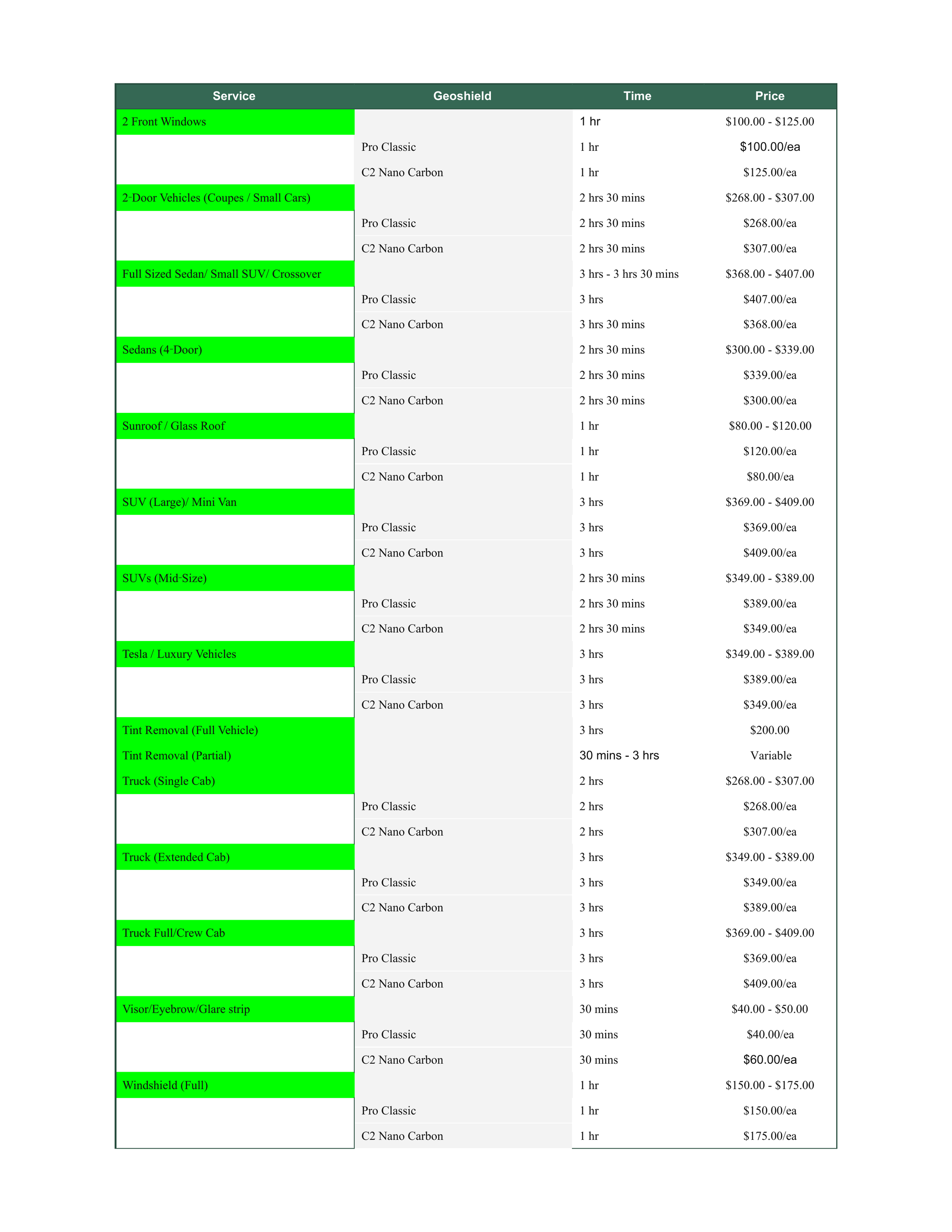 Tint Pricing